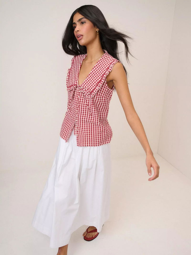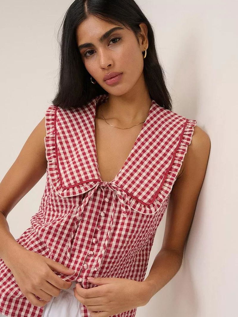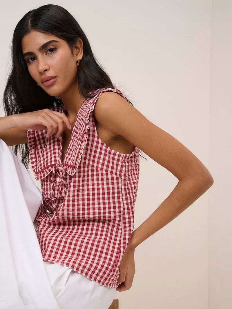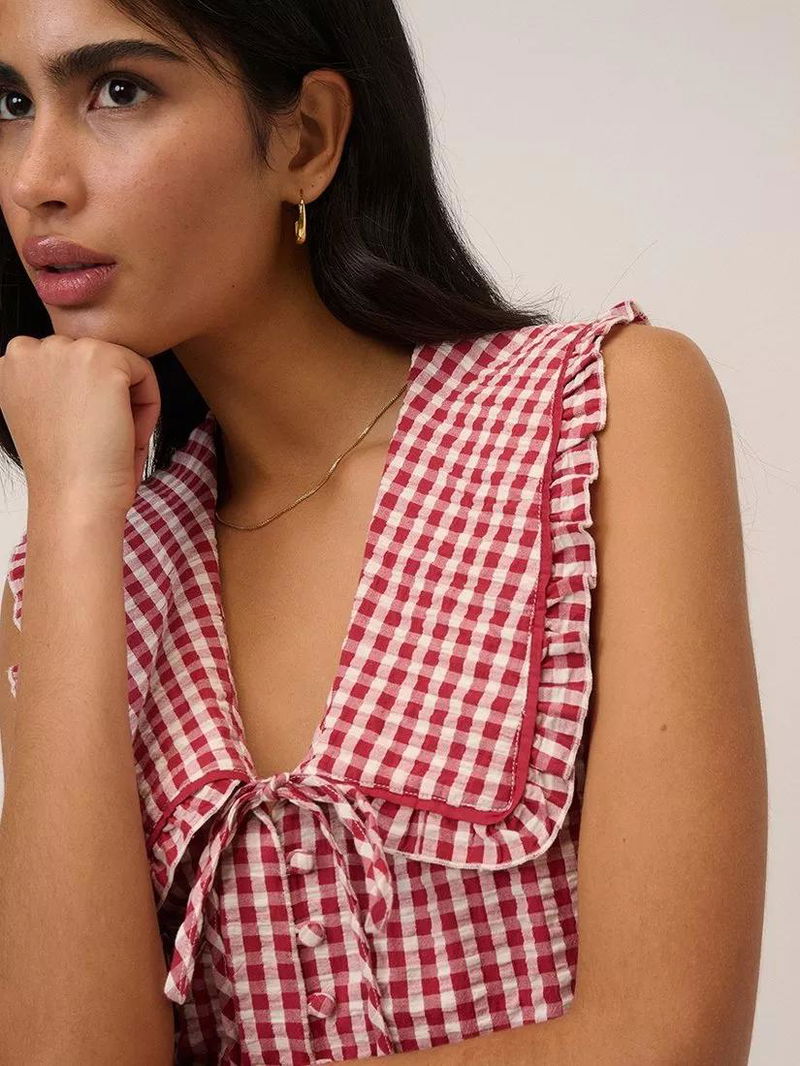 Crafted from soft seersucker cotton, this gingham top features a frilled, oversized Peter Pan collar with piping and a tie detail. Cut to a relaxed sleeveless fit, it's finished with a buttoned front. A relaxed fit, we recommend selecting your usual size.