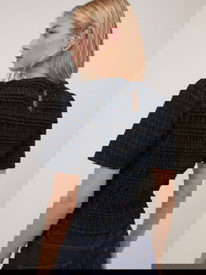The top that turns heads. We're obsessed with the blue and red statement check on this soft, short sleeved top. The all-over shirred texture gives you the perfect fit.
