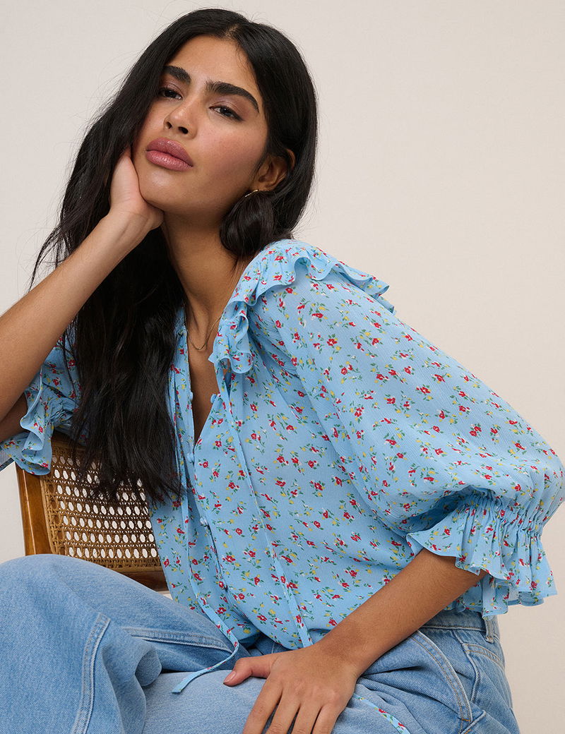 Blue Floral Frill Blouse