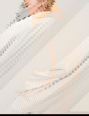 This blue and white striped shirt features a tie-style collar, long sleeves and white button front. Cut to a relaxed fit with a back box pleat for light volume, it's finished with side slits and navy NC embroidery.