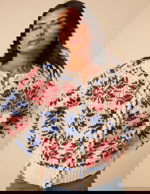Crafted from a soft cotton and wool blend, this blue and brown polka dot cardigan features a round neckline and long sleeves. Cut to a slim fit, it's finished with a pearlescent button front.