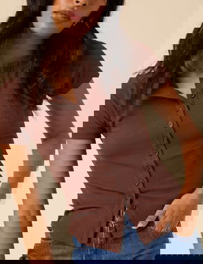 Your next go-to. In chocolate brown, this top features a pretty button front and square neck for a structured look that still keeps you feeling light. Just add the matching trousers.