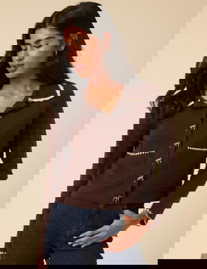 This brown and white polka dot cardigan features a pearlescent button front and long sleeves. It's cut to a slim fit and finished with ribbed trims.