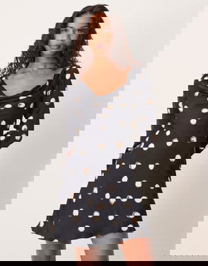 Spotted wearing this? Our floaty brown mini dress features soft pink polka dots, ruffle trims and flutter sleeves.