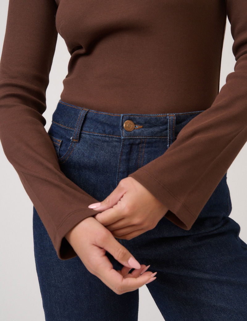 Crafted from softly ribbed cotton, this chocolate brown top features a boat neckline and long fluted sleeves. Cut to a slim fit, it’s finished with a tie-fastening scoop back.