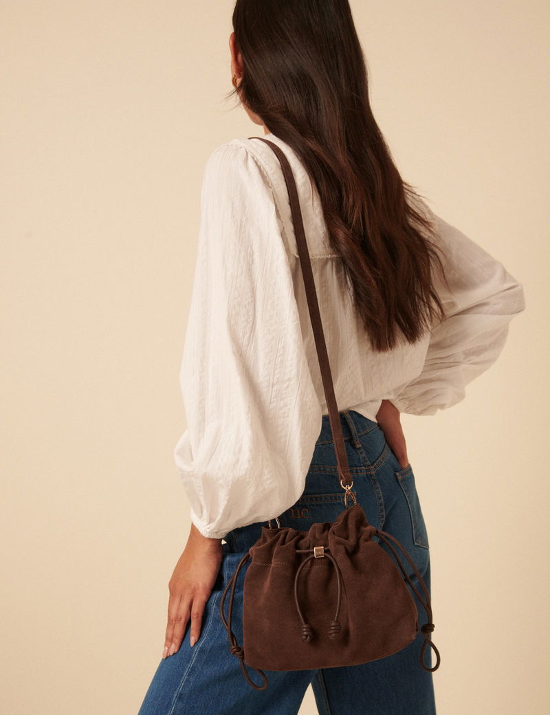 Brown Suede Drawstring Pouch Bag