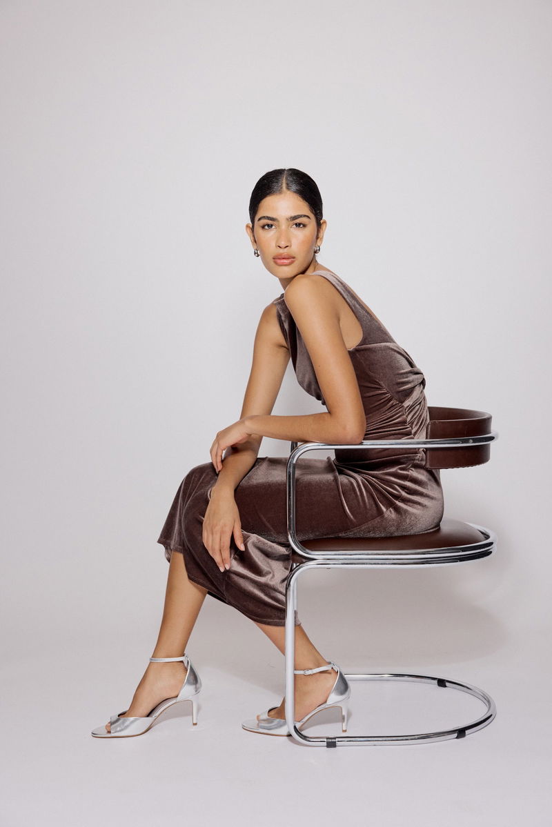 In mocha brown, this velvet midi dress features a fitted bodice, complete with side ruching. With lightweight stretch, the slim fit silhouette falls into a relaxed skirt and is finished with a twisted open back.