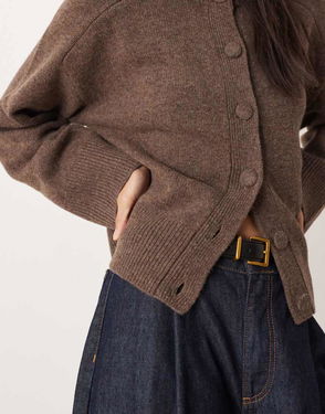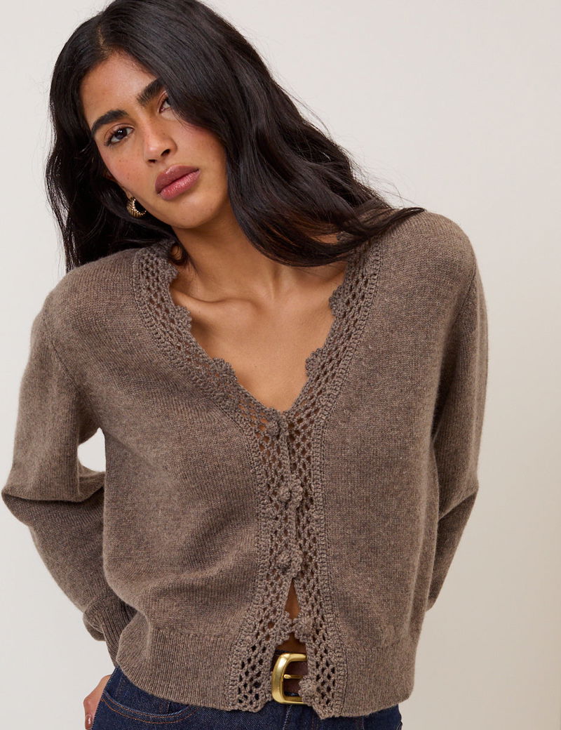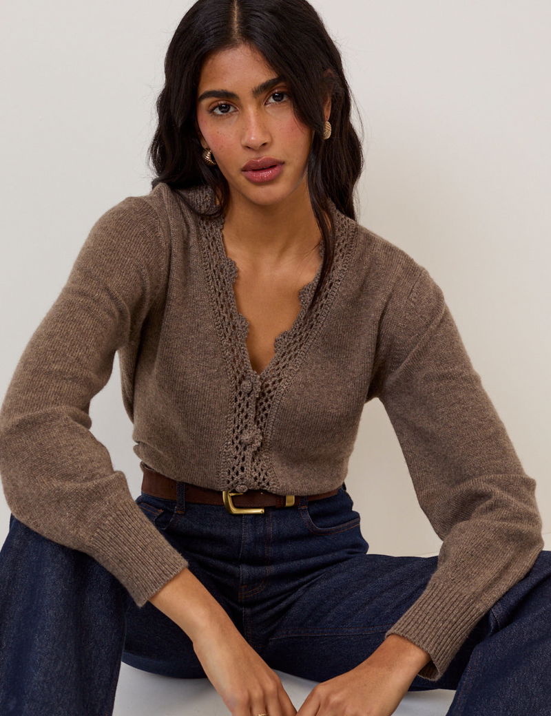 Brown Wool Blend Crochet Trim V-Neck Cardigan