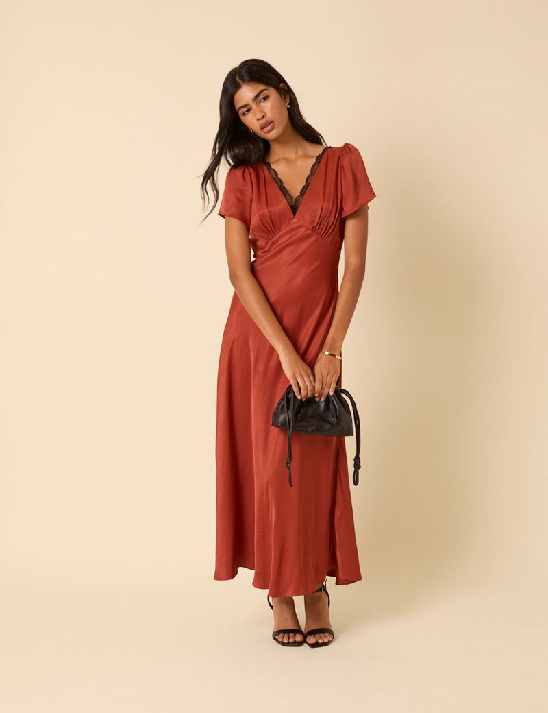 Burnt Rust Satin Lace Trim Sienna Midaxi Dress