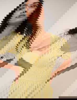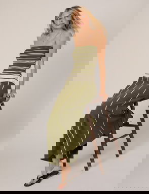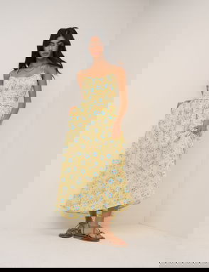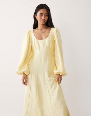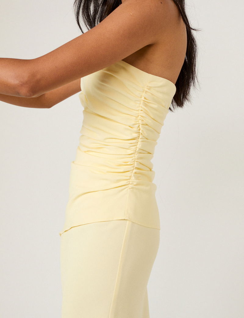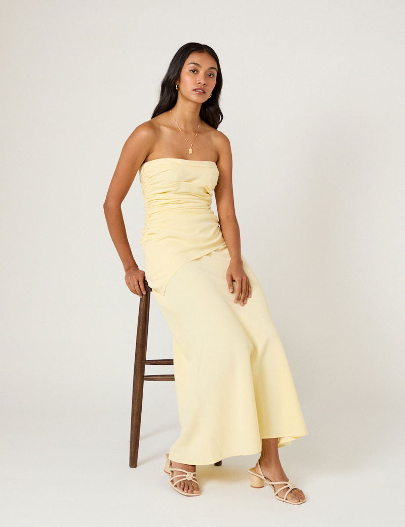 Coming in butter yellow, this bandeau midi dress features ruching along the lined bodice to softly shape the silhouette. With asymmetrical detail, it falls into a light, airy skirt that moves effortlessly.