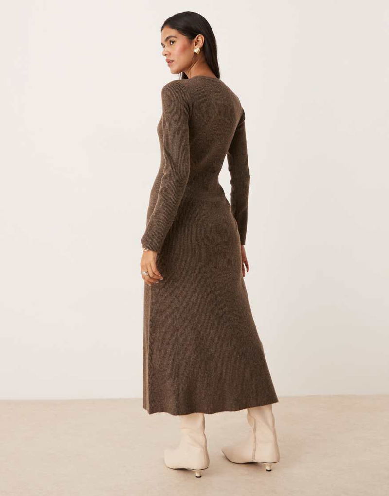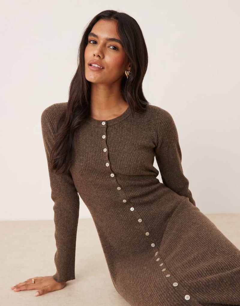 Button Through Knitted Midi Dress With Wool In Beige
