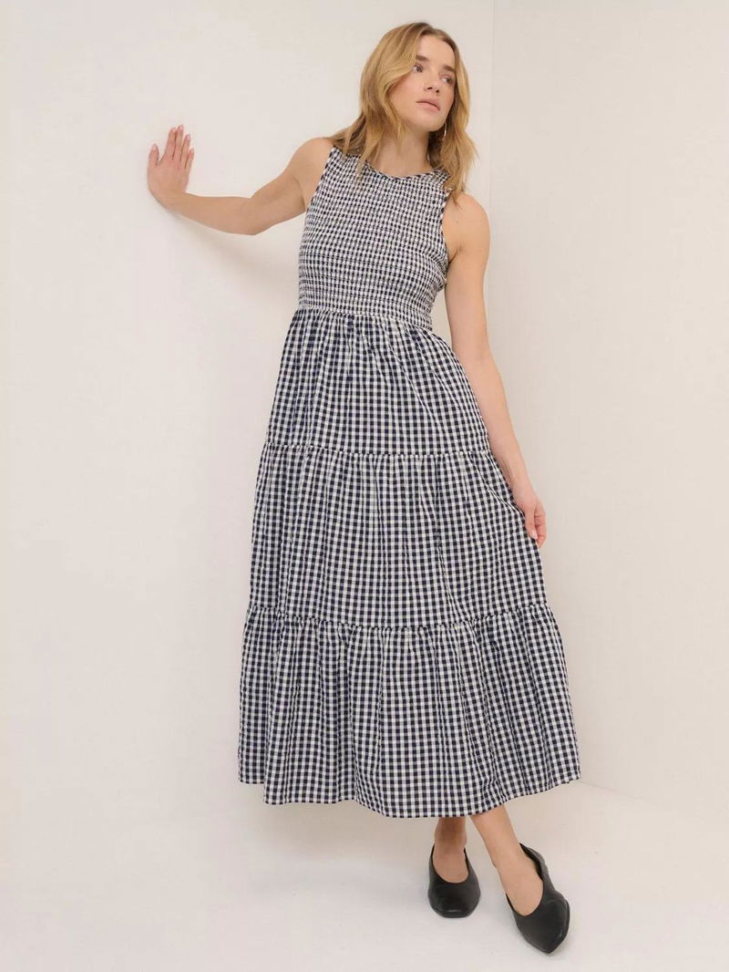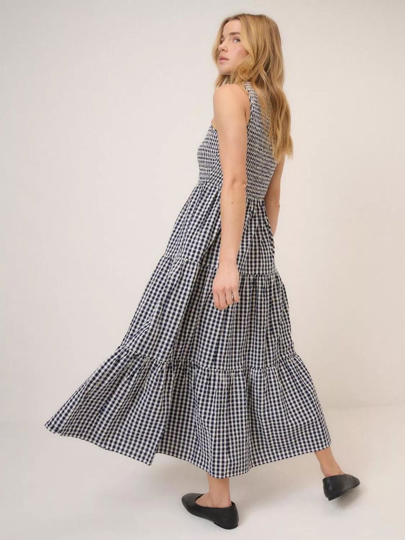 Charlie Tiered Gingham Seersucker Midi Dress, Blue/White
