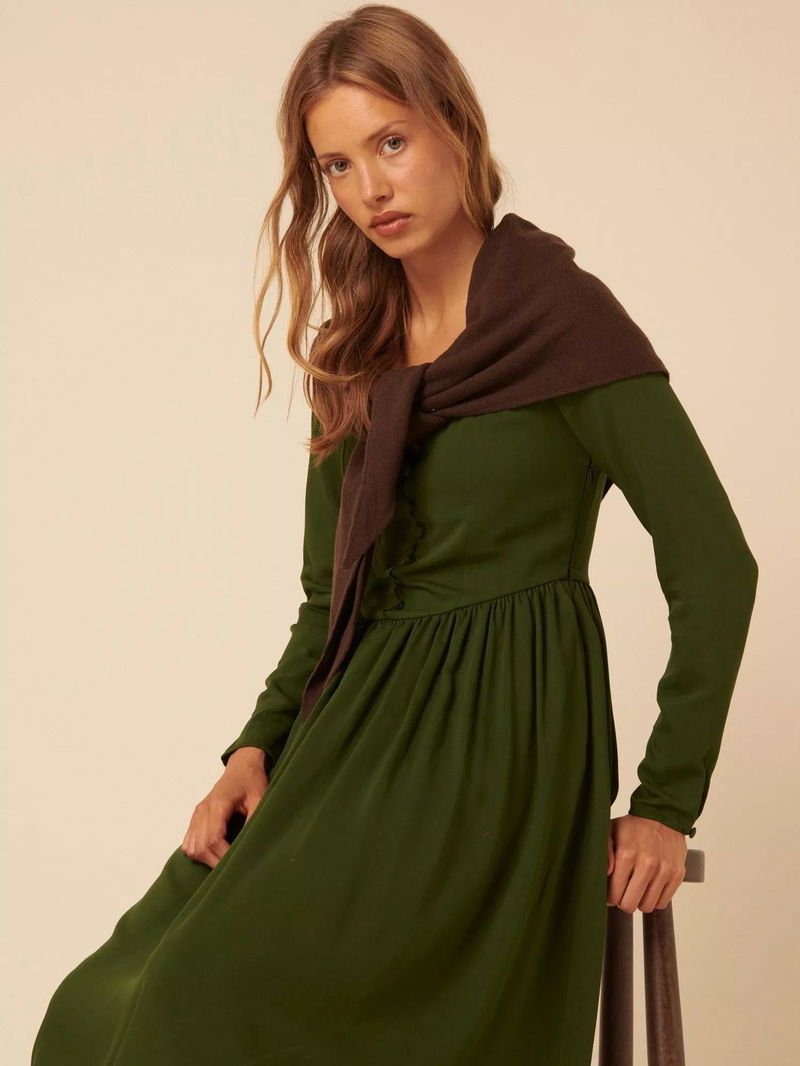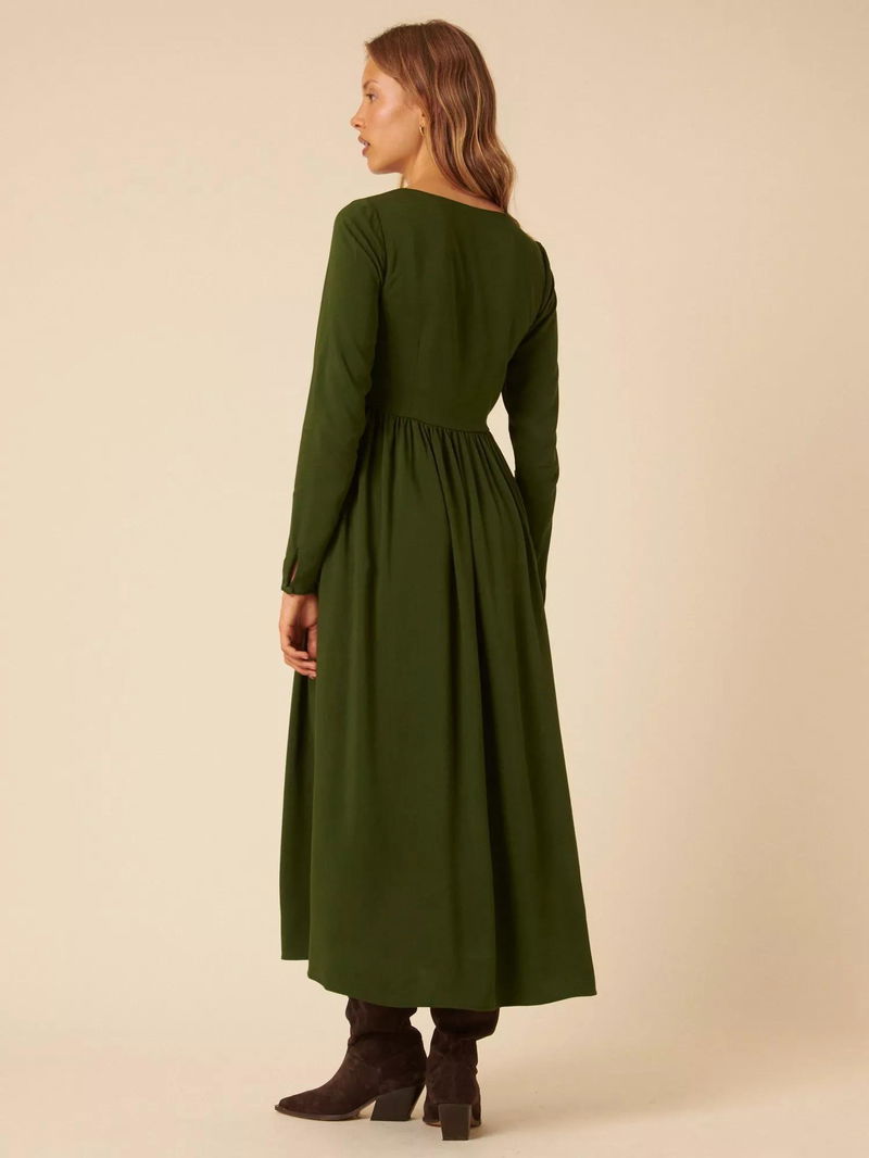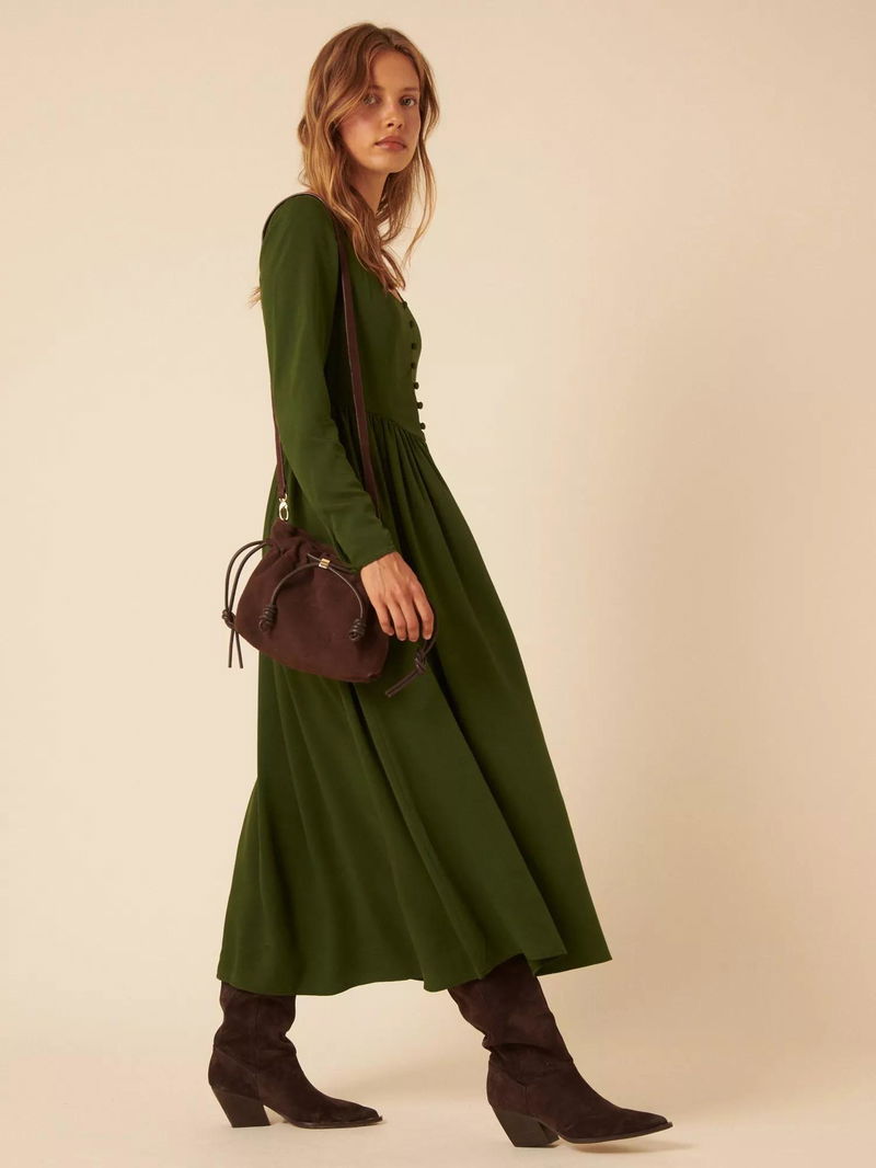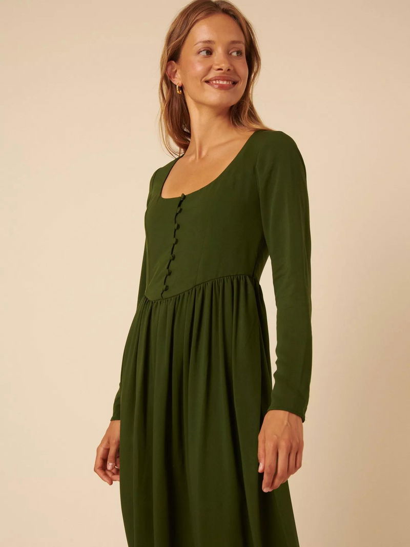 This long-sleeve midi dress features a corset-inspired bodice with button front detailing. We love the stylish dropped waist and full, pleated skirt.