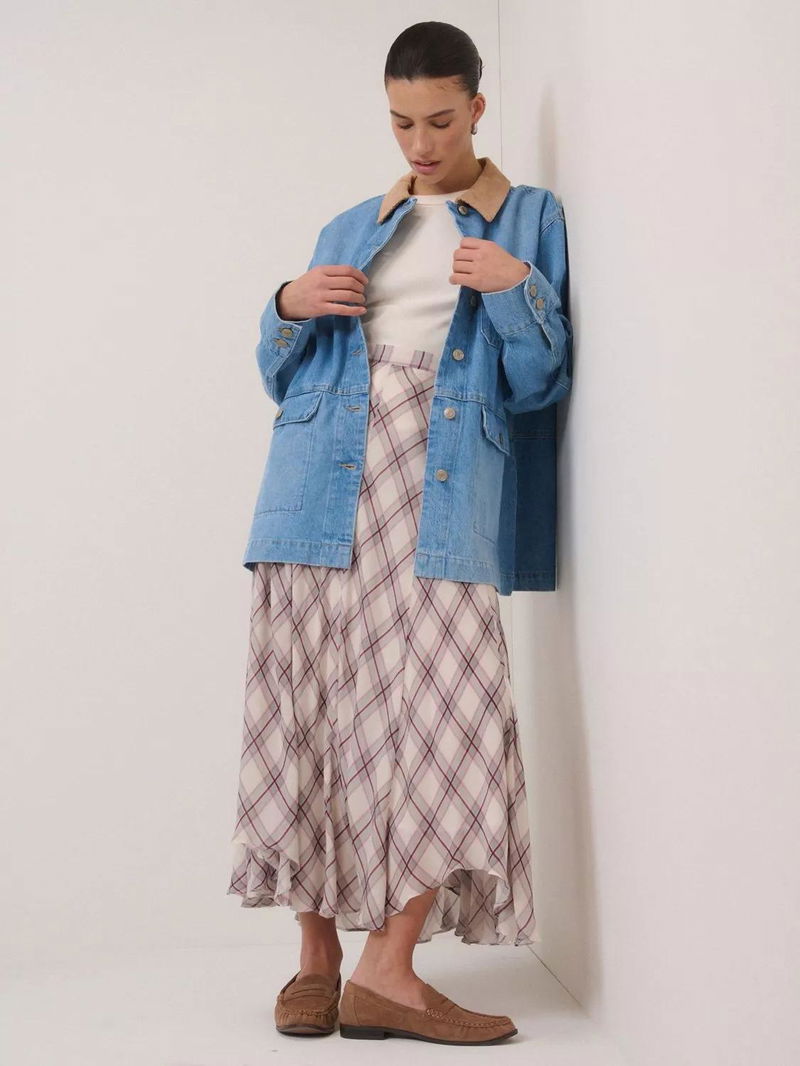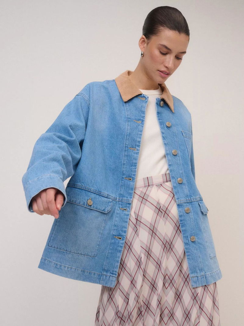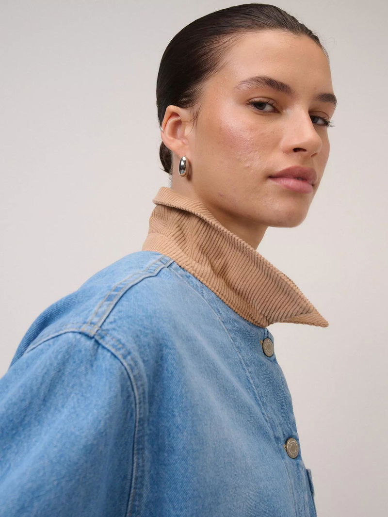 This cotton twill denim jacket features a cord collar, metallic-toned buttons and dropped shoulders. Designed with an internal tie to cinch or relax the waist, refine the fit to you.