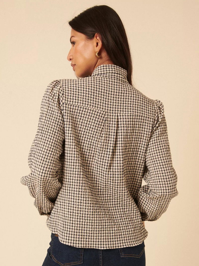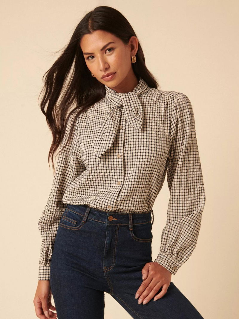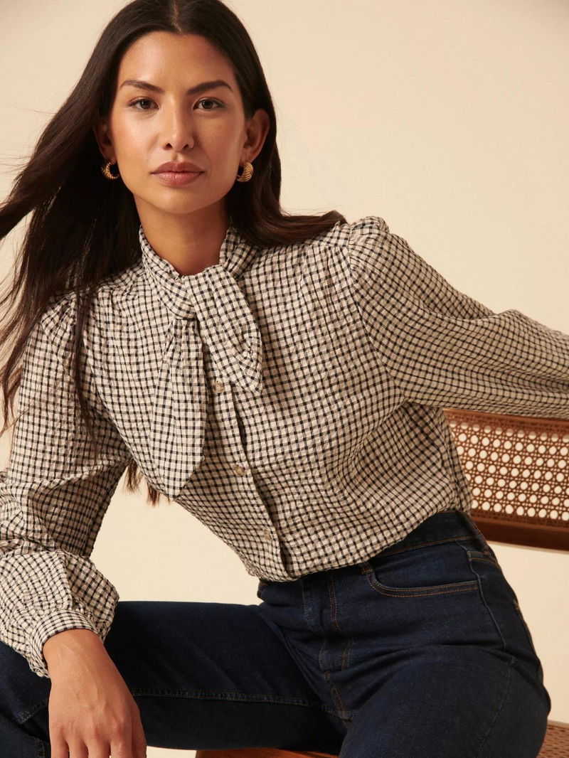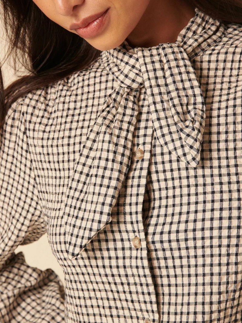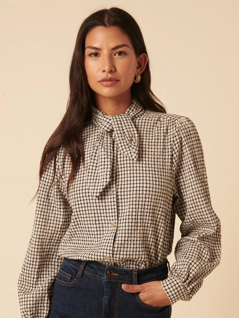 This check blouse features a neck tie scarf and long sleeves. Cut to a relaxed fit, it's finished with a mock horn button front.