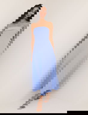 Coming in a dark indigo wash, this denim midi dress has a sleeveless design, with a round neckline and back slit. Fitted to a column silhouette, neat seams run down for light structure.