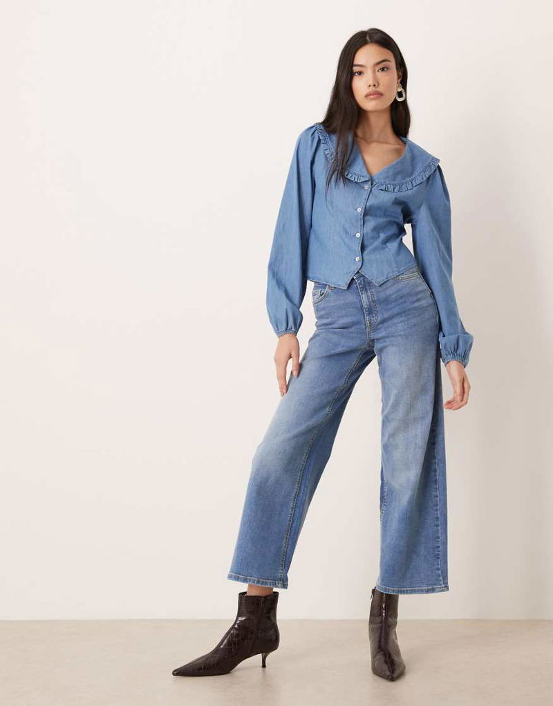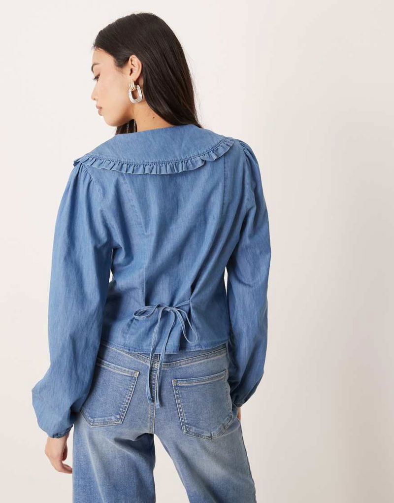 Denim Frill Oversized Collar Tie Back Shirt In Blue