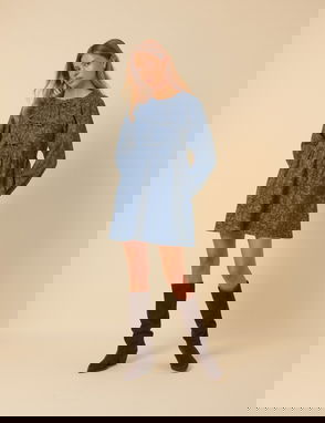 In mid-wash blue, this denim mini dress features a round neckline with a tie front and long balloon sleeves. It falls to a relaxed silhouette with side pockets.