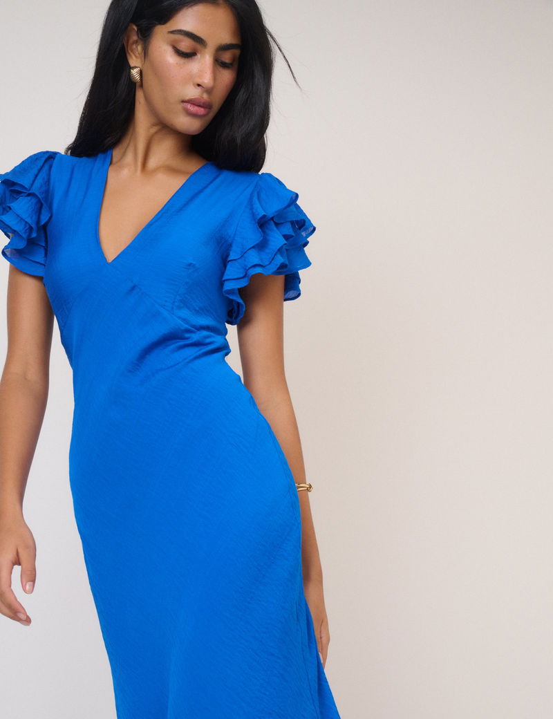 This blue midi dress features a V-neckline and short ruffle sleeves. Underbust seams shape before falling to a relaxed silhouette.