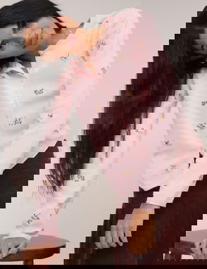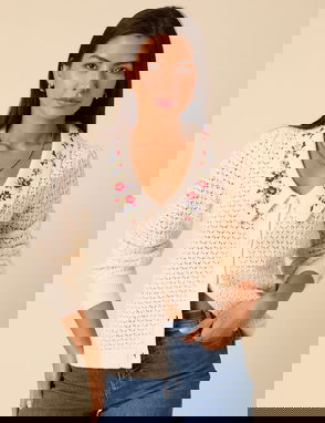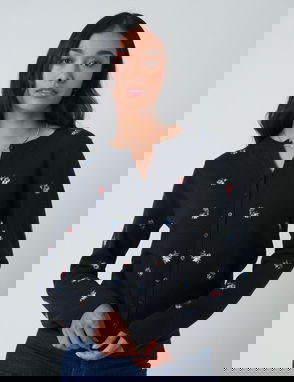 Embroidered Button Up Cardigan With Scallop Collar In Black