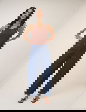 Denim which does it all Wide leg High rise Belt loops Five pockets.