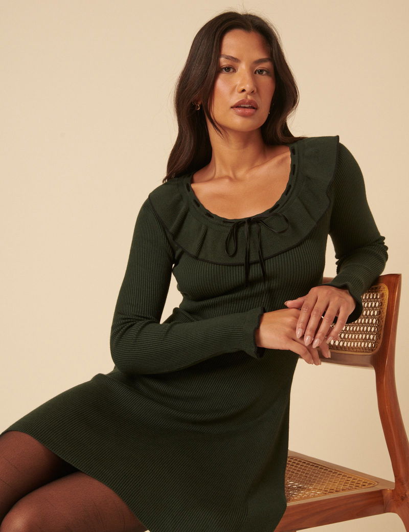 Green Collared Long Sleeve Knitted Mini Dress