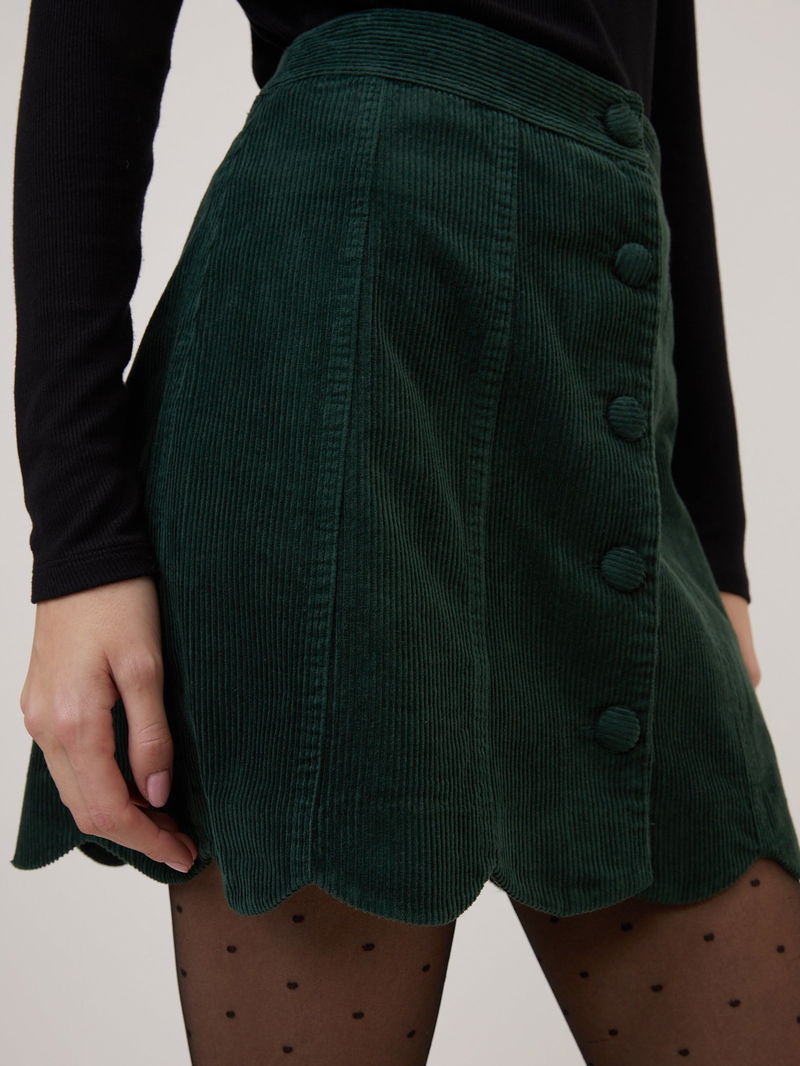 Coming in soft cord, this high waisted green mini skirt features chunky buttons and seams for light, defining structure. It's finished with a scalloped hem and relaxed fit.
