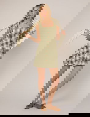 Crafted in soft cord, this dark green mini dress features a square neck and neat seams that run down the bodice to a relaxed skirt. It's finished with two velvet bows at the waist.