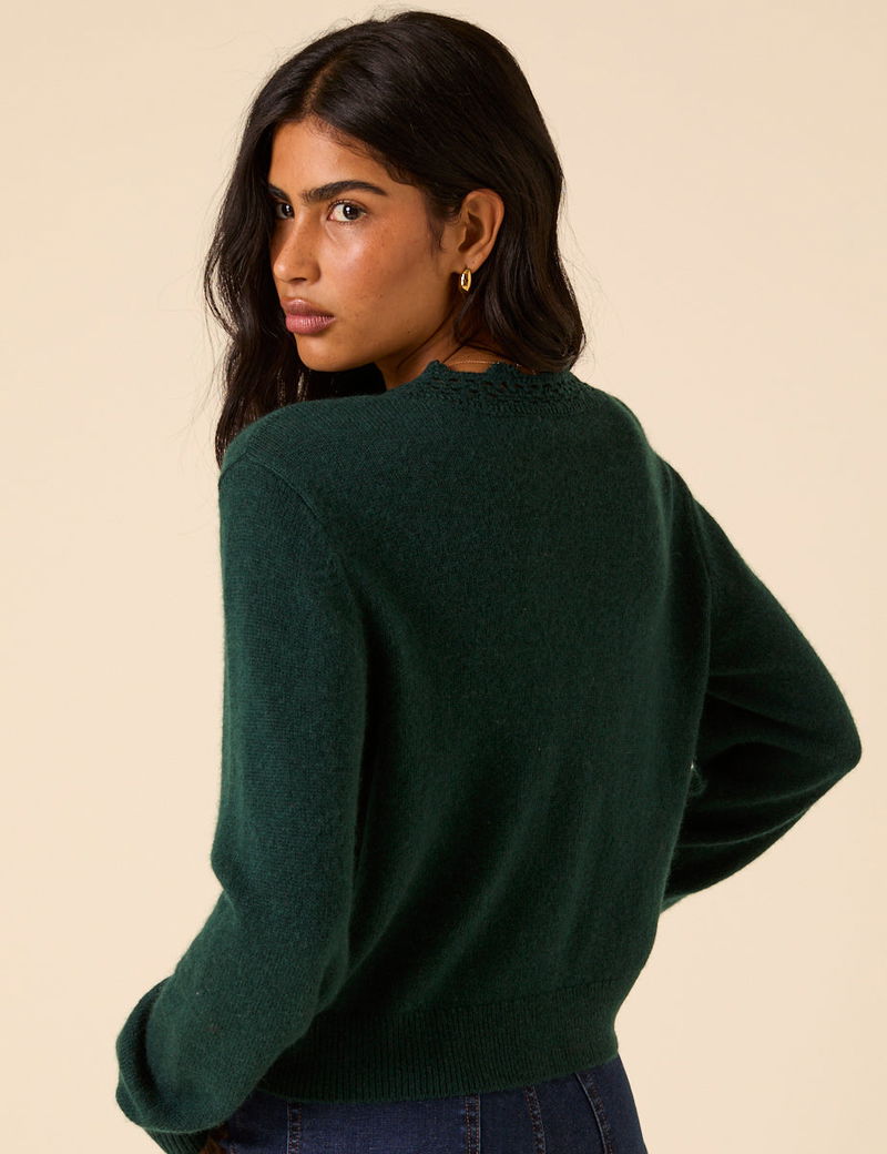 Coming in dark green, this soft cardigan features a V-neckline trimmed with crochet detailing. Designed with a button front and ribbed hem, it’s cut to a relaxed fit.