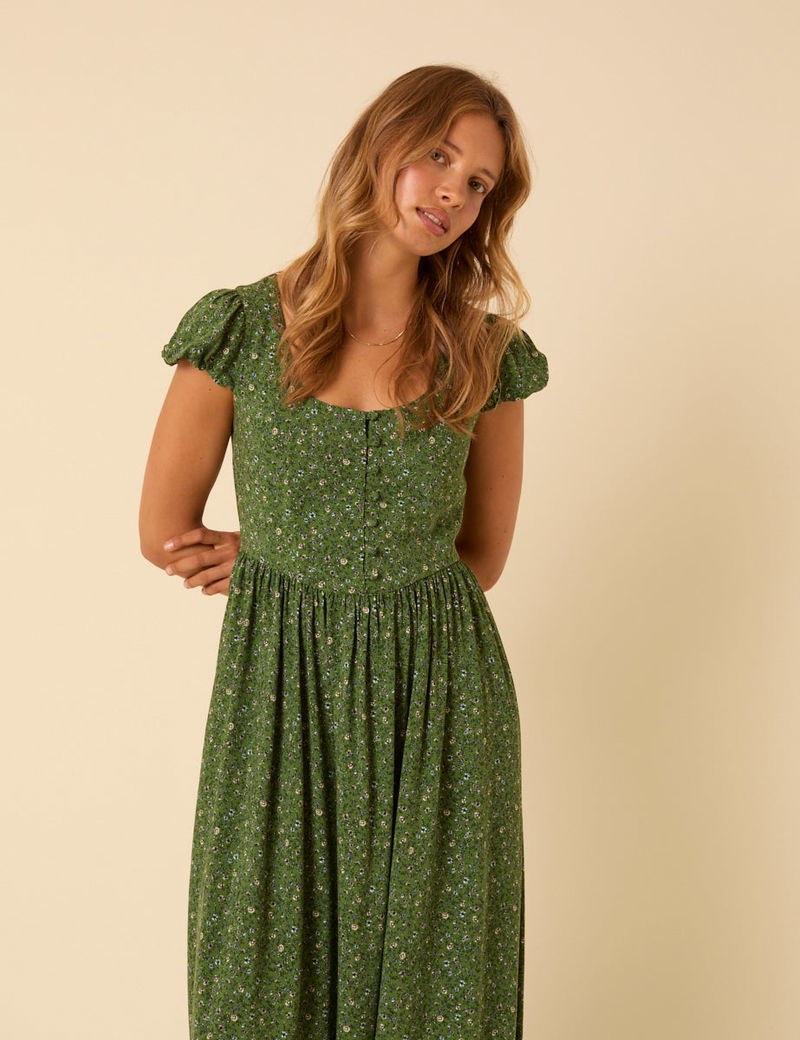 Green Ditsy Floral Puff Sleeve Cora Midi Dress