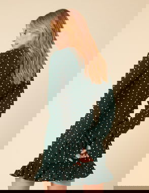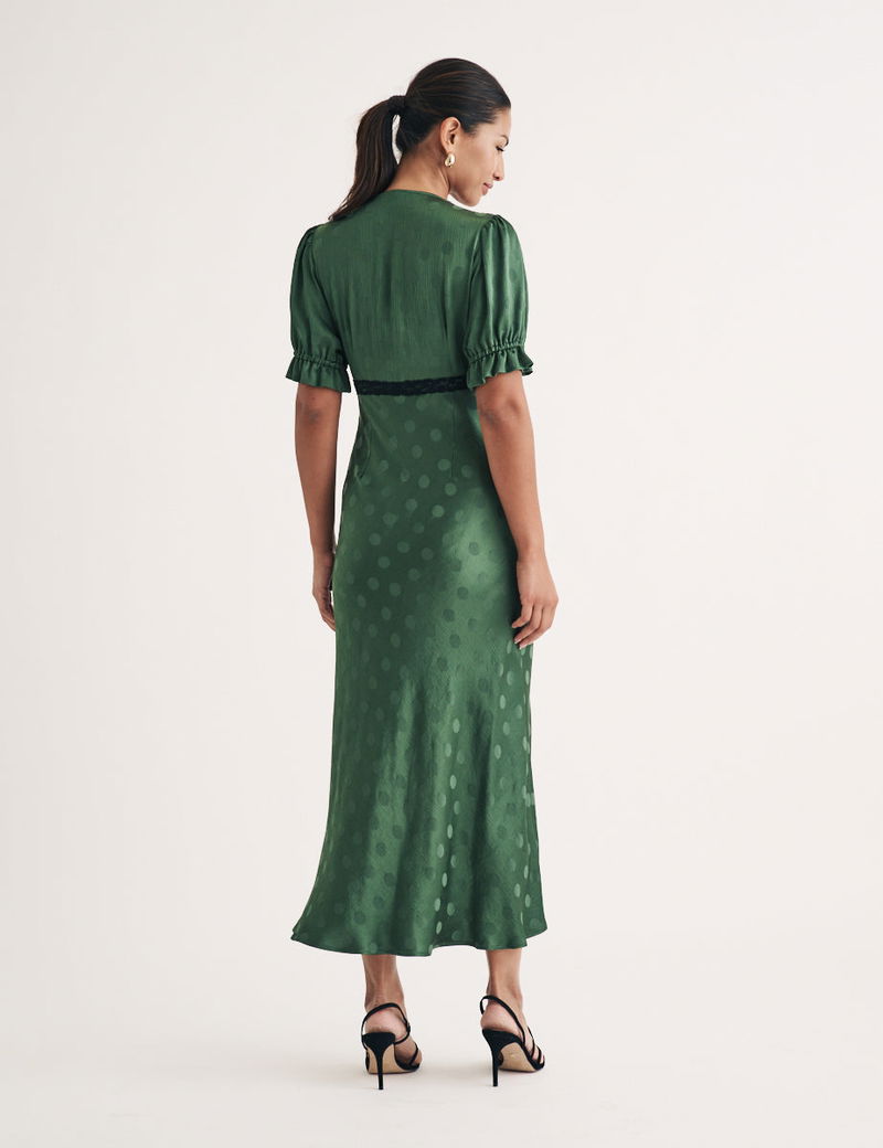 Own the night in Angela. In green with polka dots, this satin midi dress features an empire waistline that falls to a relaxed skirt. We love the lace V-neck and ruched detailing.