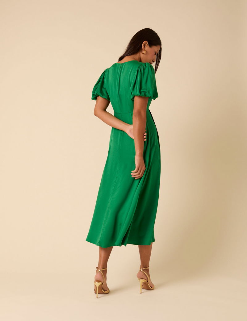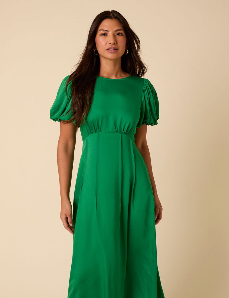 RSVP yes. Coming in green, this midi dress features short, puff sleeves and an empire waistline that falls to a flowy skirt. We love the pintuck detailing for light volume.