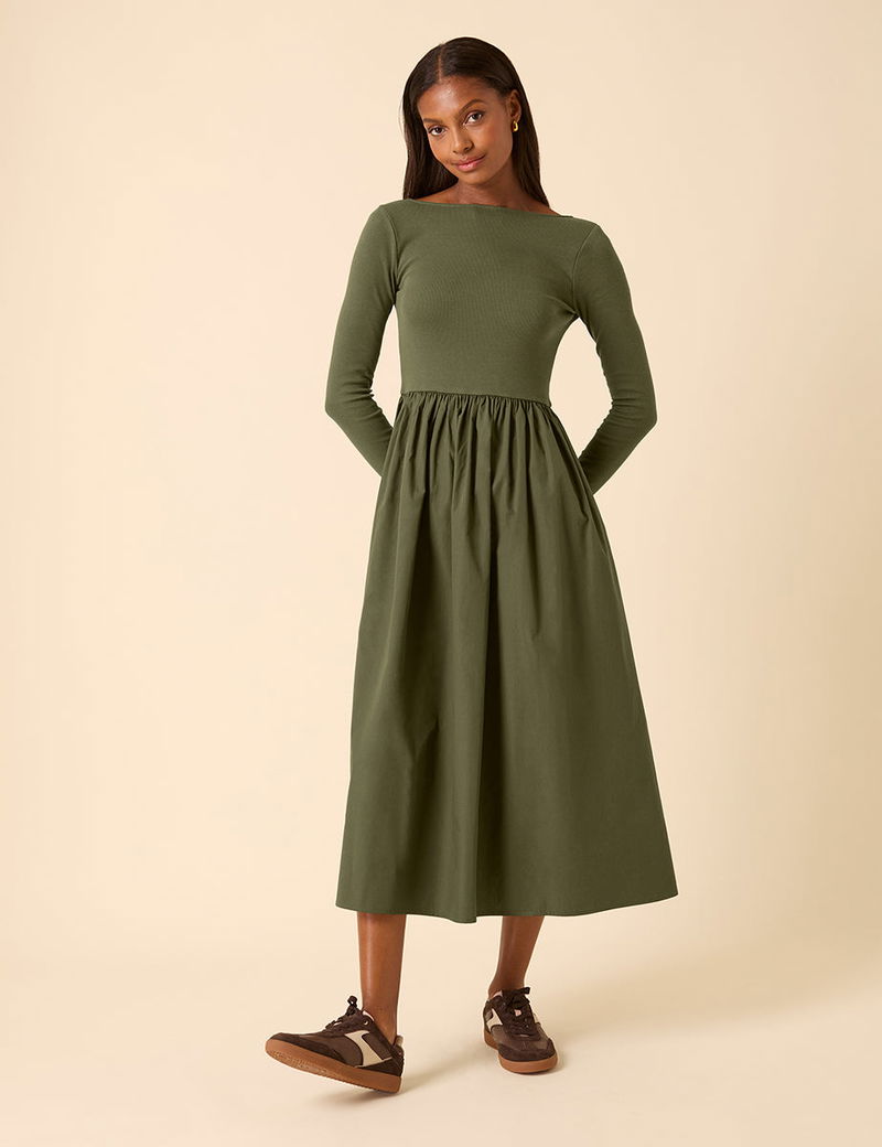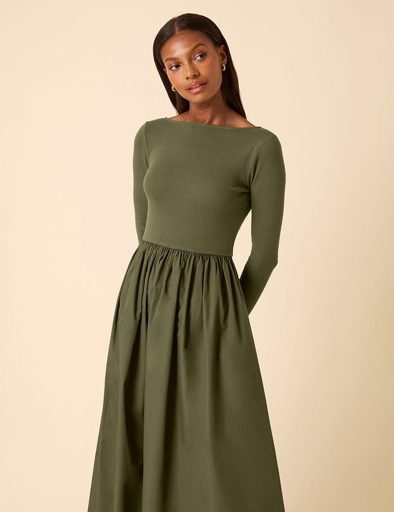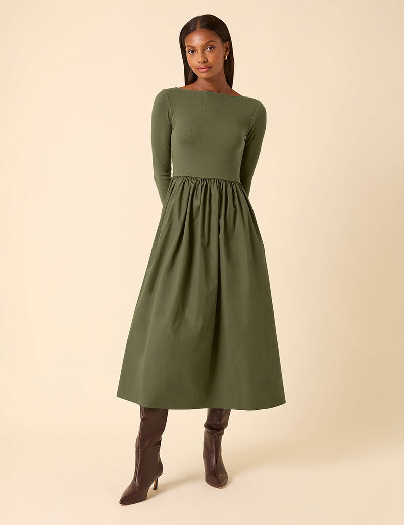 This khaki midi dress features a boat neck, long sleeves and a scoop back. The soft jersey bodice is cut to a slim fit and falls to a relaxed, cotton skirt.
