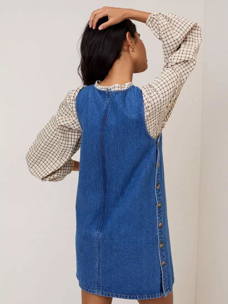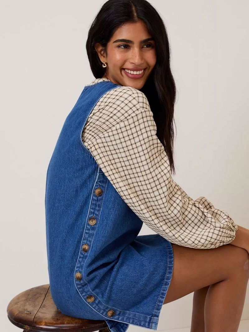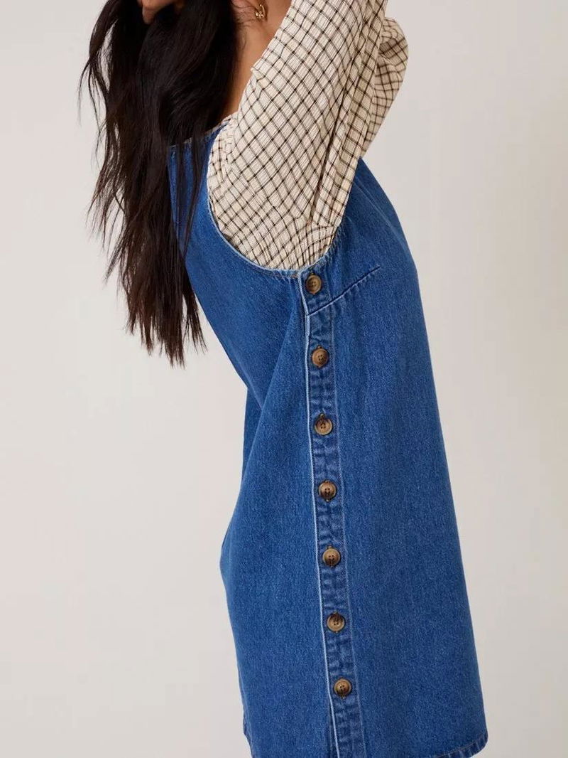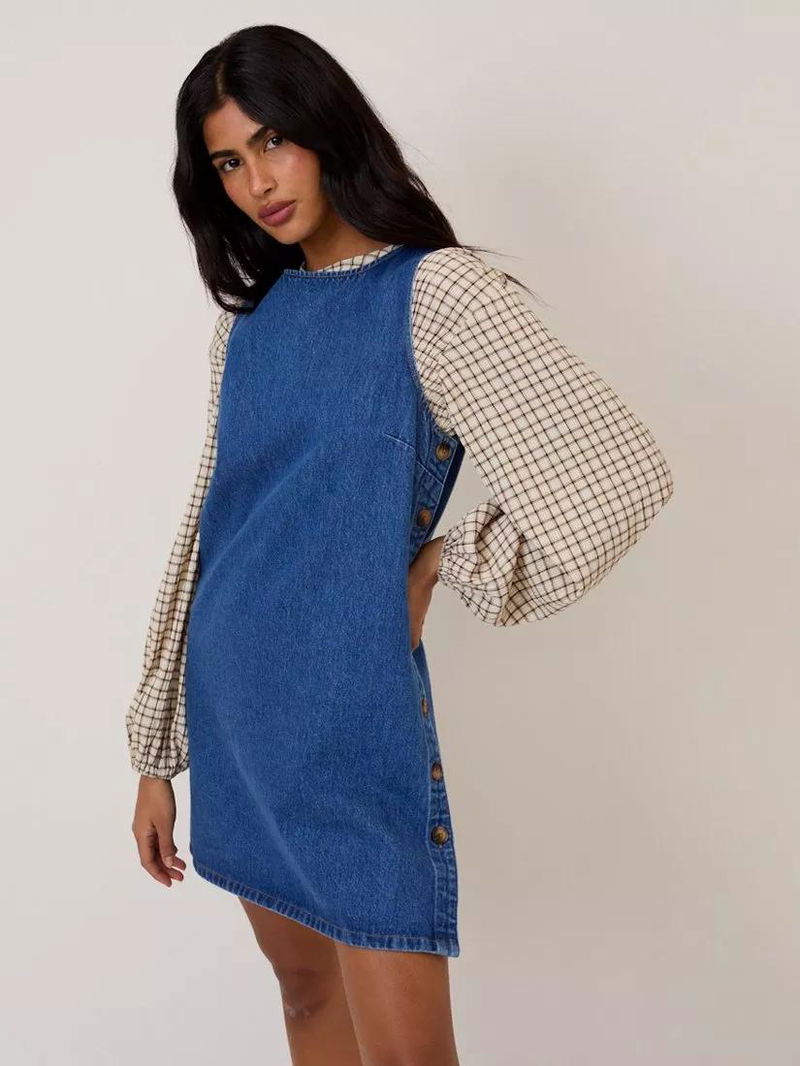 This denim pinafore mini dress features a round neckline and mock horn buttons at the sides. It's cut to a softly shaped shift silhouette for ease.