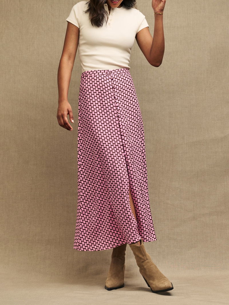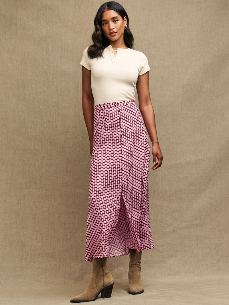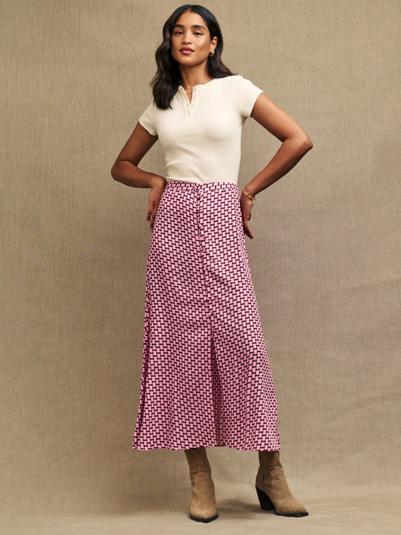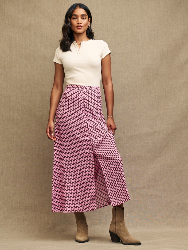 Embracing effortless femininity with an A-line silhouette, this calf-grazing skirt from Nobody's Child is defined by a dramatic geometric print. Beloved for its weightless feel and starting at the top of the hips, simply prepare to pair it with all manner of casual separates.