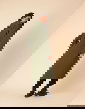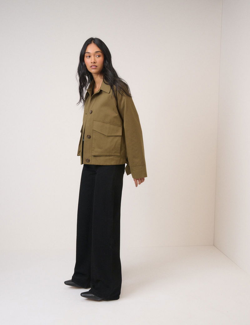 This khaki jacket features a collar, long sleeves and brown buttons. Cut to a relaxed boxy fit, it’s finished with tie-fastenings at the elasticated hem and utility-style flap pockets.