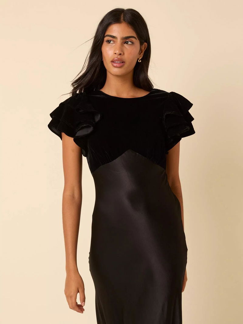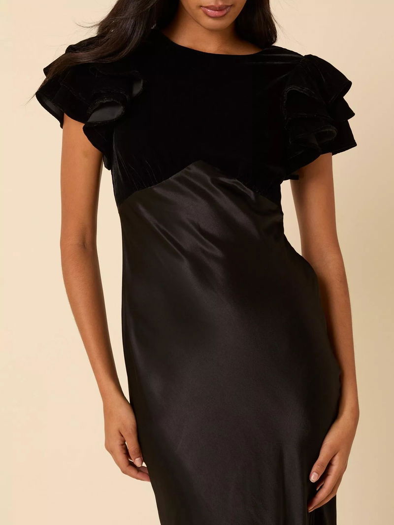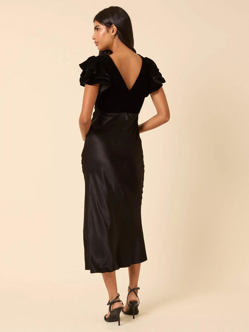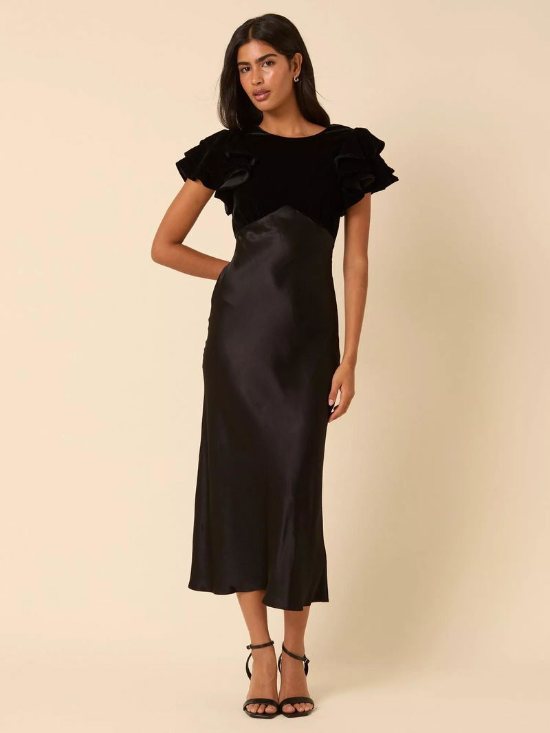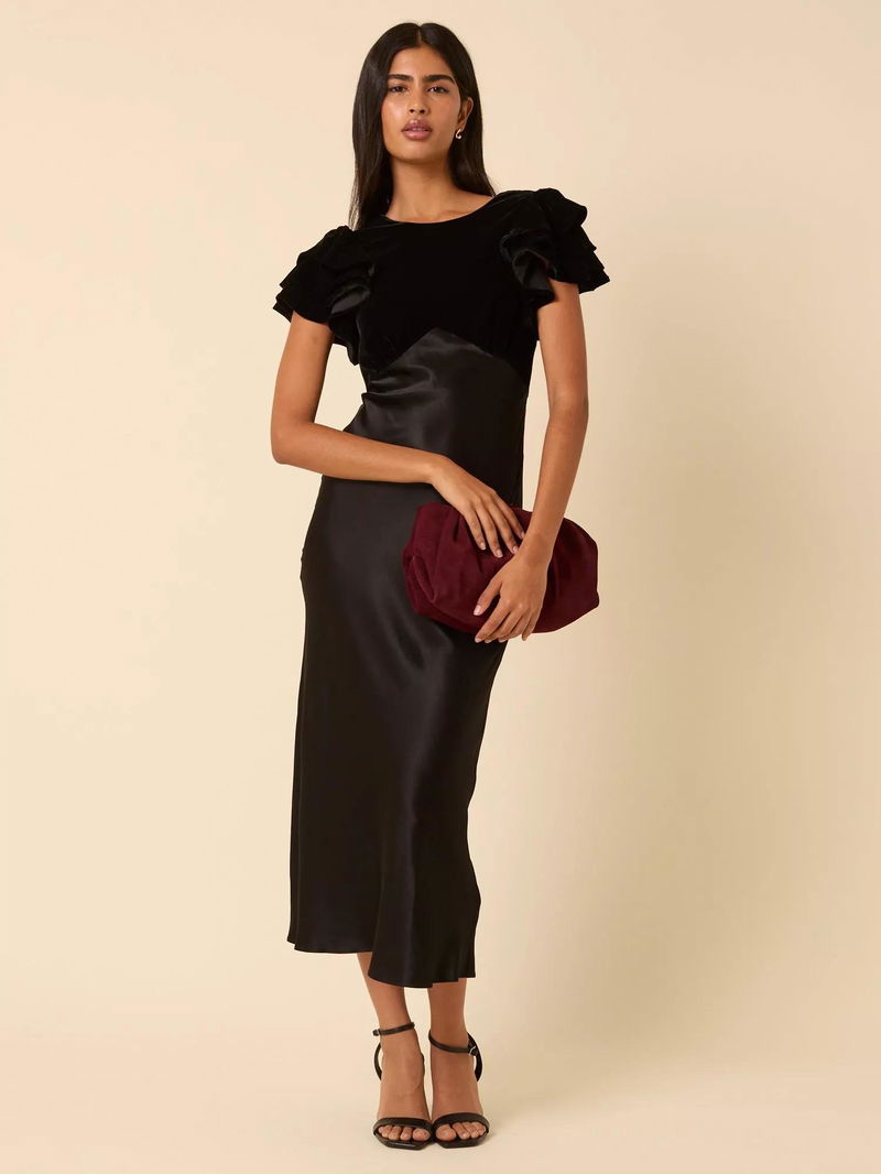 Timeless meets modern, this midi dress features short, flouncy sleeves and gathered detailing. We love her flowy, A-line skirt.