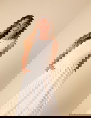Effortless. Designed with a dropped waist and a square neckline with thin straps, this midi-length dress cuts close with a gathered A-line skirt that skims the body. String ties loop into a bow at the back. Fastens with a concealed zip closure.
