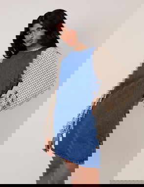 Lykke a-line denim pinny mini dress in mid wash. V-neck. Tie front. Keyhole detail. Sleeveless style. Mini cut. Regular fit.