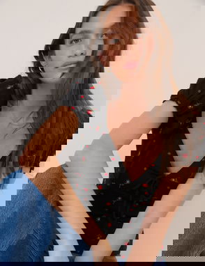 Your new go-to top. In navy with floral embroidery, this top features a frill square neck and half-length, puff sleeves. The elasticated, shirred detailing gives this top an all-day, comfort fit.