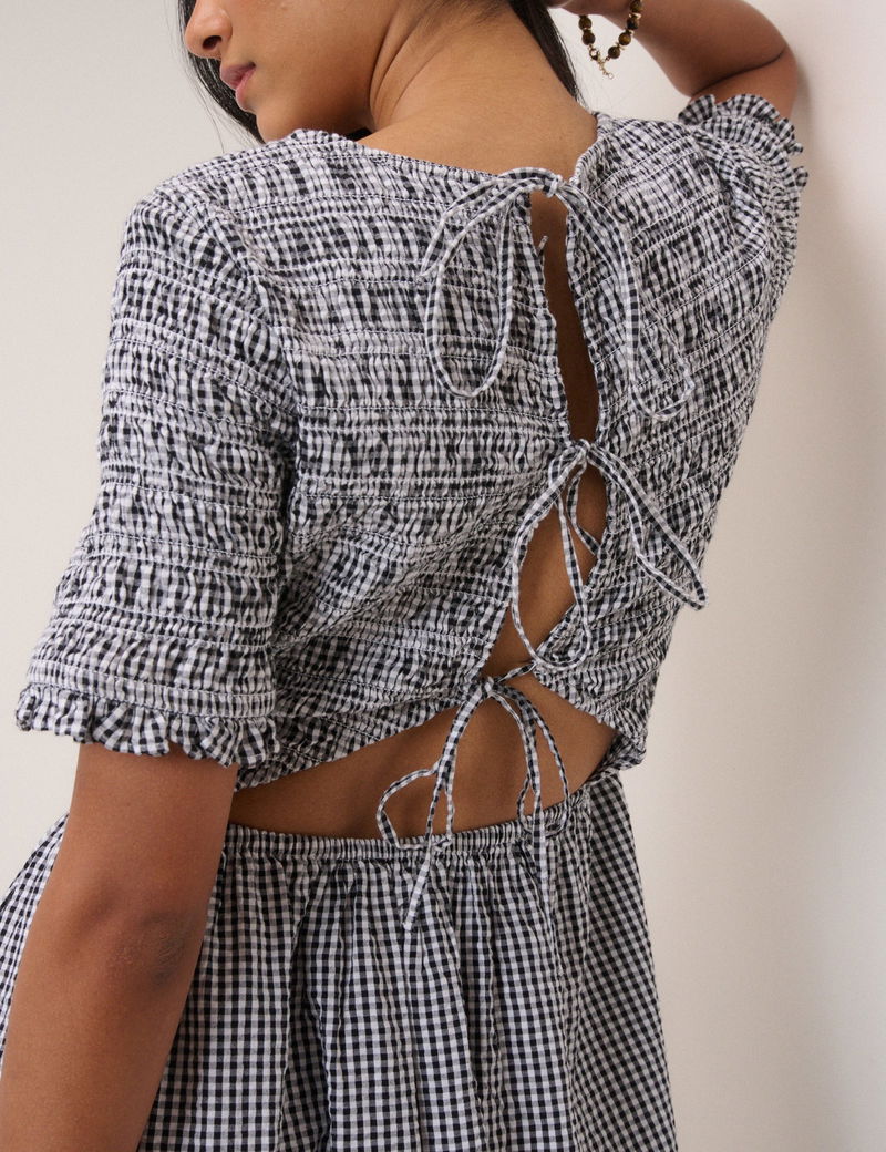 Navy Gingham Shirred Leah Midi Dress