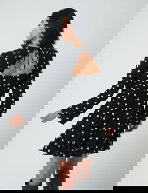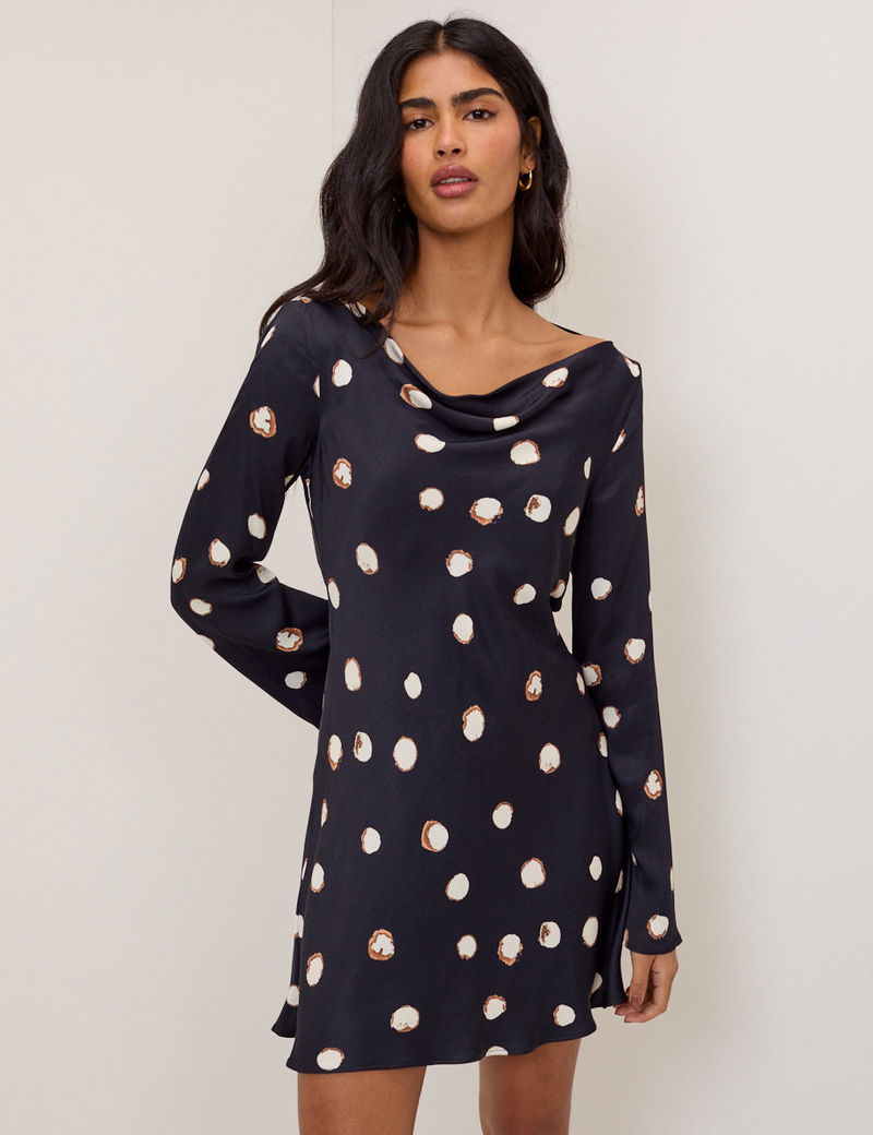 Crafted in satin, this black mini dress features abstract, ivory and brown polka dots and a cowl neckline. Cut to a fluid silhouette, it moves with ease and is finished with a low, draping back.