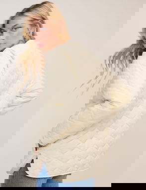 The layer you’ll love. Coming in navy, this soft, quilted jacket features pretty floral detailing and a statement trio of ties. We love the frilled patch pockets and relaxed fit.