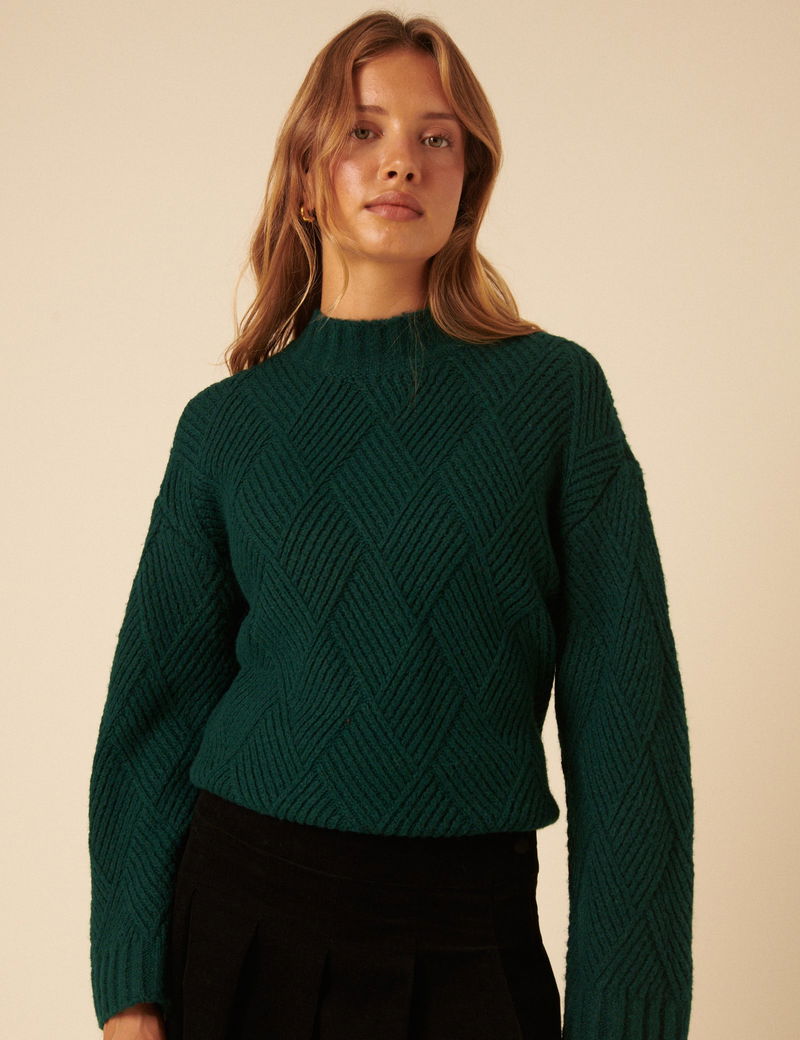 This dark green jumper is knitted in a diamond checkerboard pattern and features a mock neck and long sleeves. Cut to a relaxed, boxy fit, it’s finished with wide ribbed trims.
