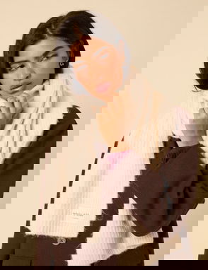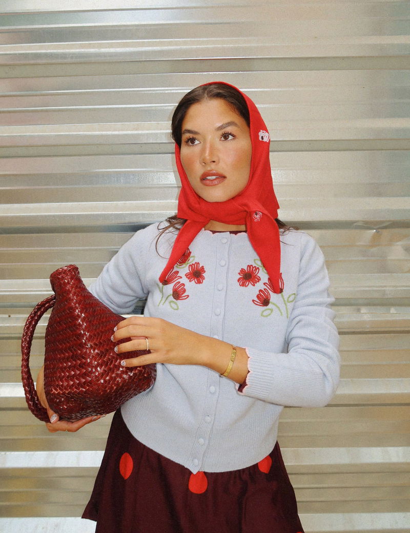 This piece is part of the Nobody’s Child x TBCo Collection, a B Corp-certified brand from Scotland. Crafted from pure merino wool, this red triangle scarf is embroidered with blue hand-drawn florals. This piece can be tied at the neck or styled as a headscarf.