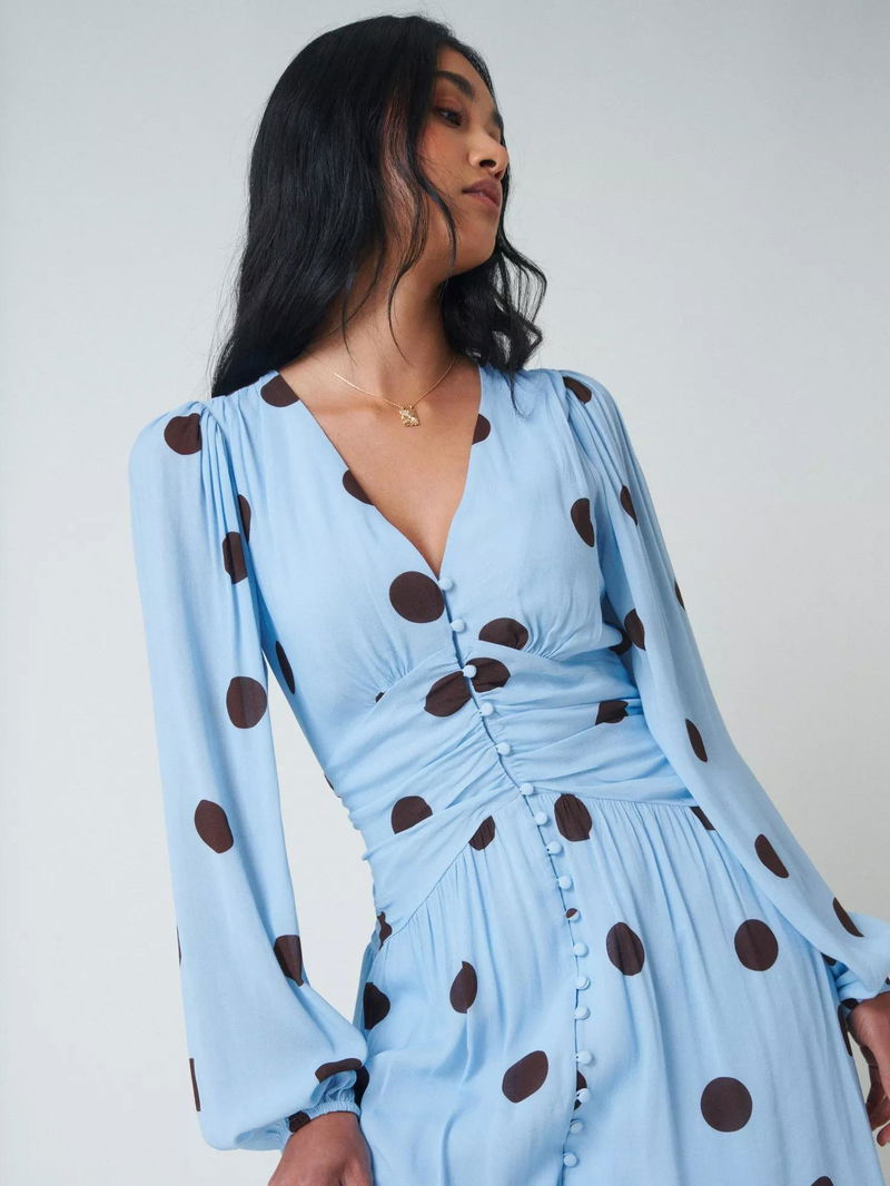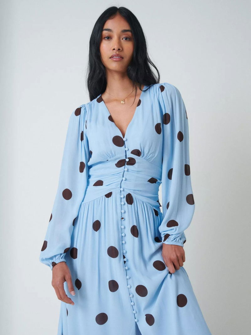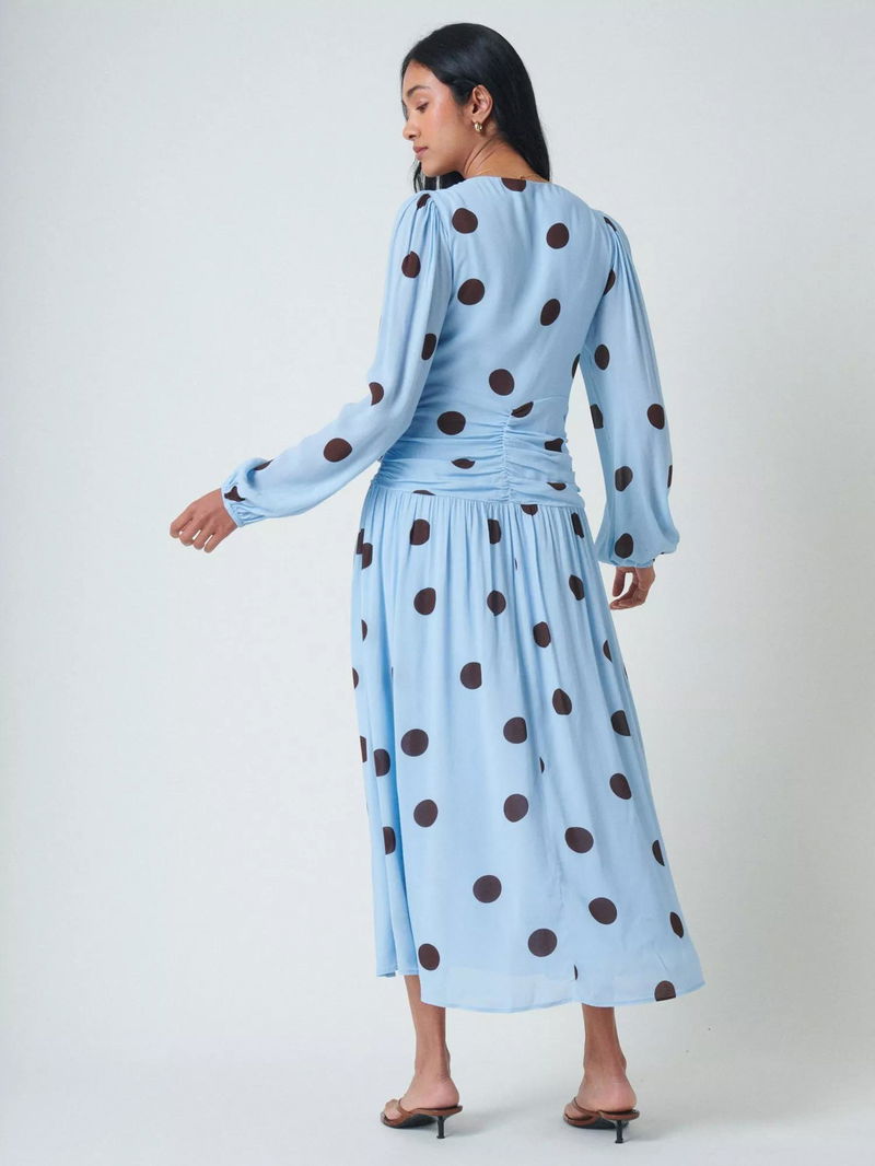 Petite Luna Ruched Waist Polka Dot Midi Dress Containing LENZING™ ECOVERO™ Viscose, Blue/Black