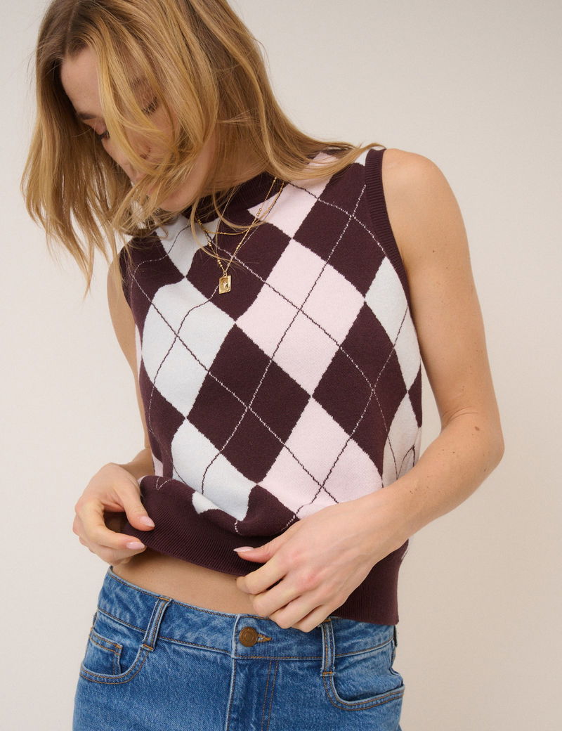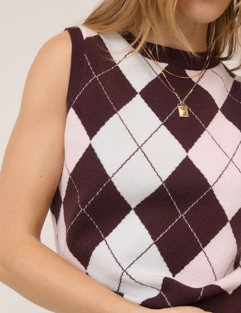 Pink And Brown Knitted Argyle Vest Top