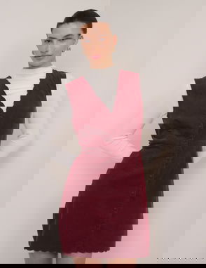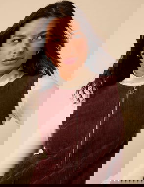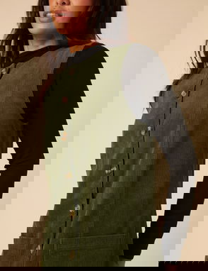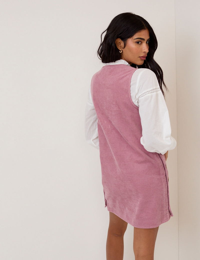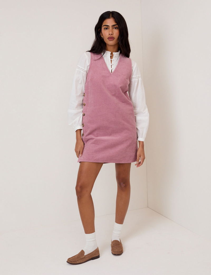 Crafted in soft cord, this dusty pink pinafore dress features a V-neckline and mock horn buttons at the sides. The softly shaped shift silhouette falls with ease.