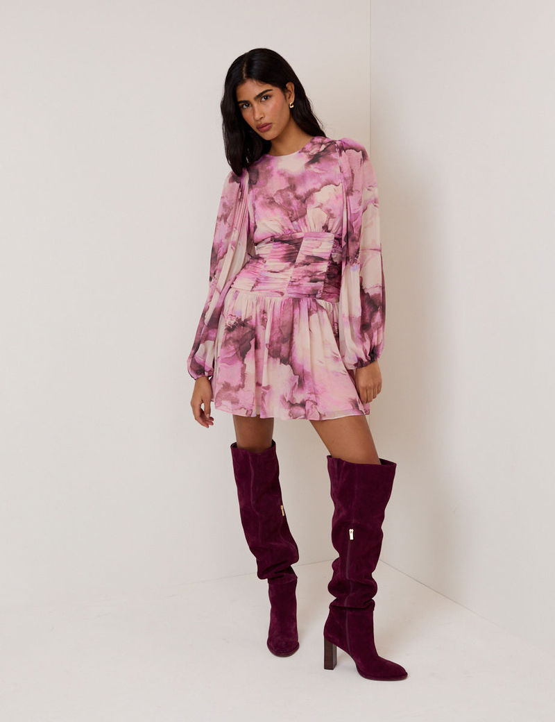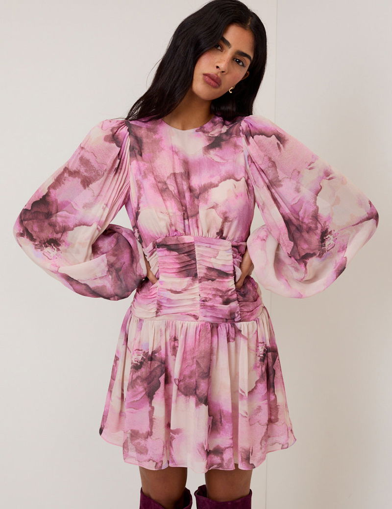 Hand-painted in watercolour florals, this pink and purple mini dress features a round neckline and long balloon sleeves. The ruched, panelled waist shapes the bodice before falling to a relaxed skirt.