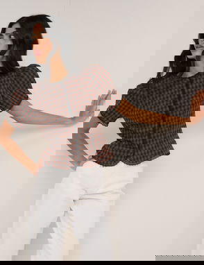 Puff sleeve button down top. Square neck. Button placket. Puff sleeves. Tie-back fastening. Regular fit.